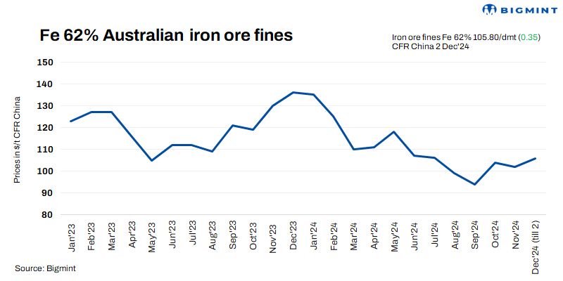 China’s iron ore fines (Fe 62%) spot prices inched up by $0.35/t d-o-d to $105.80/t CFR on 2 Dec’24. The market improved amid strong buying interest and expectations regarding favourable policies. Although hot metal production dipped last week, pre-holiday restocking demand has provided support. Strong demand for seaborne cargoes of Dec-Jan laycans, expected to arrive before the Lunar New Year, has sustained stable premiums.