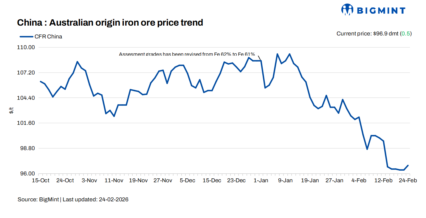 Iron ore fines (Fe 61%) spot prices rose by $0.5/dmt to $96.9/dmt d-o-d CFR China on 24 Feb. Prices gained support as market activity picked up after the holidays, especially in the primary market. Supply was slightly tight, making cargoes more competitive. However, mills remained cautious and showed limited interest in buying spot cargoes, while traders preferred to hold onto material, waiting for better market opportunities.