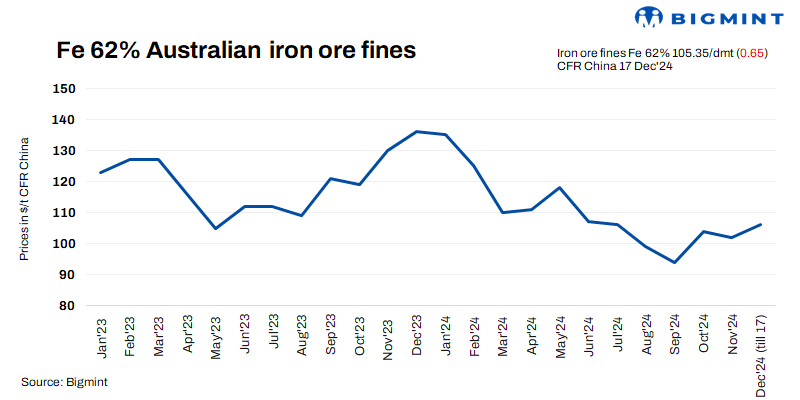 Iron ore fines (Fe 62%) spot prices dipped by $0.65/t d-o-d to $105.35/t CFR China on 17 Dec’24, pressured by abundant portside inventories and increased preference for cost-effective alternatives, which offer favourable specifications. Blending options and weak buying interest for seaborne cargoes arriving during the Lunar New Year further dampened demand, softening premiums for the latter.