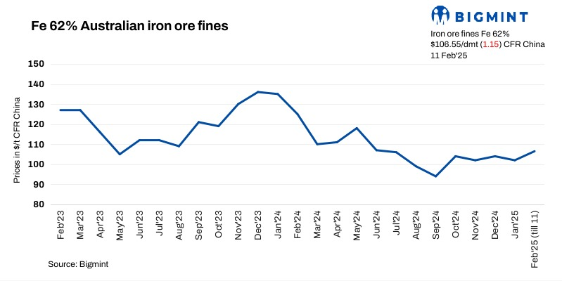 China’s iron ore fines (Fe 62%) spot prices dipped by $1.15/t d-o-d to $106.55/t CFR on 11 Feb’25 due to sluggish buying. Steel mills, facing margin pressure and declining prices, held back on purchases after the US imposed 25% tariffs on steel and aluminium imports. Reportedly, mills were unwilling to make further purchases amid rising iron ore prices, due to their inability to sell steel products.