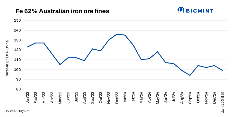 China’s iron ore fines (Fe 62%) spot prices dropped by $1.75/t d-o-d to $97.05/t CFR on 6 Jan’25. Trading activity slowed amid weak fundamentals ahead of the Lunar New Year holidays, and seaborne demand is not expected to improve. Consequently, low-grade and discounted products will likely remain the most cost-effective options for end-users. As per reports, raw material prices and margins may remain low.