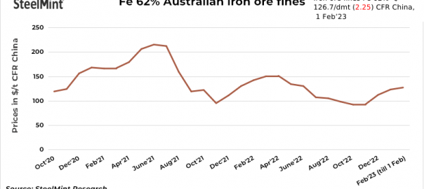 Iron ore spot prices in China moved down by $2.25/t d-o-d on 1 Feb’23. Benchmark Fe 62% fines prices stood at $126.7/t CFR. Prices fell due to lack of buying interest, resulting in few transactions being concluded. Sources said that offers in the secondary market fell on the day amid significant import losses between the seaborne and portside iron ore markets