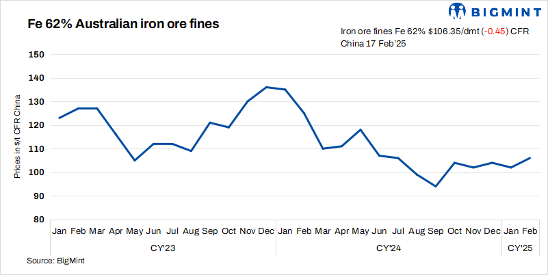 China’s iron ore fines (Fe 62%) spot prices declined for the third consecutive day on 17 Feb’25, by $0.45/t d-o-d to $106.35/t CFR, amid cautious buying, stemming from weak market fundamentals. Reportedly, the market remained largely unchanged, with procurement lagging due to weak mill margins. Australian ports and mining operations are gradually resuming post-Hurricane Zelia, but shipments have been affected, leading to delayed vessel schedules.