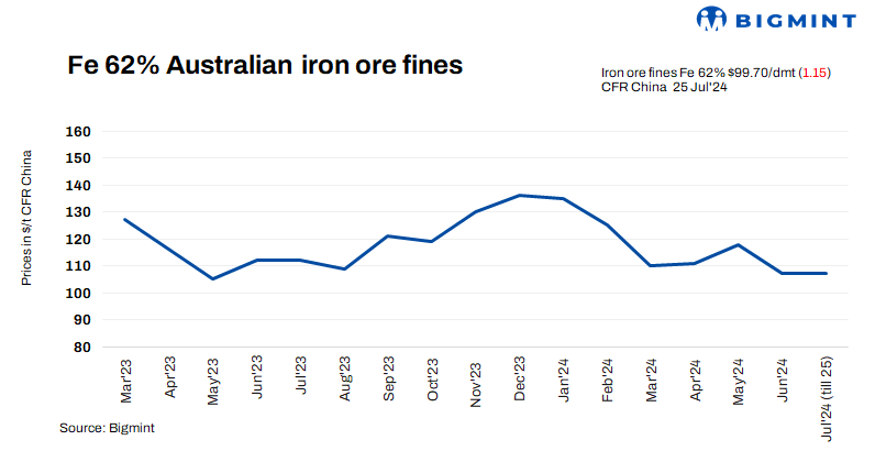 Iron ore fines (Fe 62%) spot prices dropped to over 3-month low (against Apr’24) by $1.15/t d-o-d to $99.7/t CFR China on 25 Jul’24 amid limited trading activity following weak market fundamentals. Even the recent reduction of key interest rates by China’s central bank failed to improve sentiment, highlighting the seriousness of the country’s economic issues.