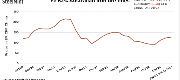 Iron ore spot prices in China inched down by $0.40/t d-o-d to $130.20/t CFR China on 23 Feb’23 due to weak iron ore liquidity in the market. Sources stated that the market’s seaborne buying interest remained limited as most market players were cautious. At the portside, trading activities were active and steel mills continued to purchase according to their needs.
