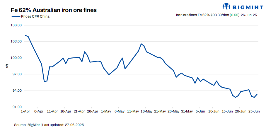 Iron ore fines (Fe 62%) spot prices rose by $0.55/t d-o-d to $93.30/t CFR China on 26 Jun’25, supported by fresh bookings in the mid-grade segment. As per reports, strong finished steel data led to a market recovery in the afternoon session, but this did not stimulate much trading activity or significantly raise iron ore prices. Chinese port-stock prices continued to hold firm d-o-d in recent trades.