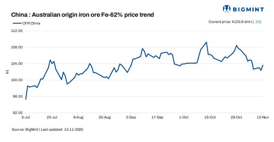 Iron ore fines (Fe 62%) rose by $1.25/dmt to $103.6/dmt CFR China on 12 Nov’25. Prices inched up mid-week despite thin spot activity. Discounts for mid-grade fines narrowed slightly amid moderate trade, while supply was adequate. Demand for high-grade material weakened, as mills faced margin pressure. Port-stock prices recovered modestly after recent declines.