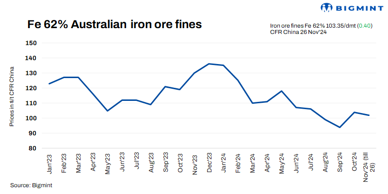 Iron ore fines (Fe 62%) spot prices rose $0.4/t d-o-d to $103.35/t CFR China on 26 Nov’24 amid winter restocking ahead of the Chinese New Year in Jan’25. While some mills maintained low inventories following high port stocks and import losses, others resold cargoes amid decent liquidity for medium-grade fines. Mills strived to keep blast furnace feed ratios flexible; planned maintenance may restrict price hikes.