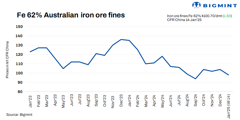 China’s iron ore fines (Fe 62%) spot prices rose $1.5/t d-o-d to $100.7/t CFR on 14 Jan’25, amid improved steel mill margins following lower coking coal and coke costs. Strong demand for medium- and low-grade sintering fines continued, aided by mild winter weather, which sustained construction activity in northern China. With most mills completing January restocking, a potential demand increase is expected in February, post-holidays.