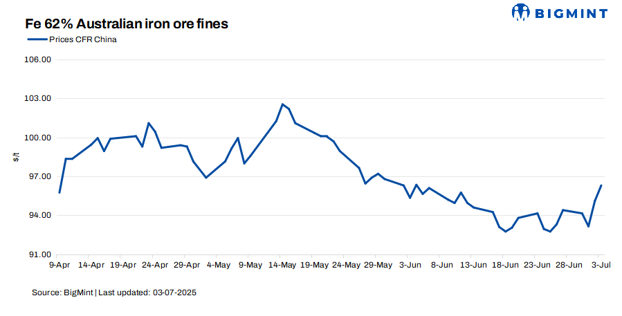 Iron ore fines (Fe 62%) spot prices inched up by $1.2/t d-o-d to $96.3/t CFR China on 3 Jul’25, with recent trades driven by temporarily elevated crude steel output. Rising buying interest in direct feedstock materials is expected to persist in the short term, driven by low port inventories.