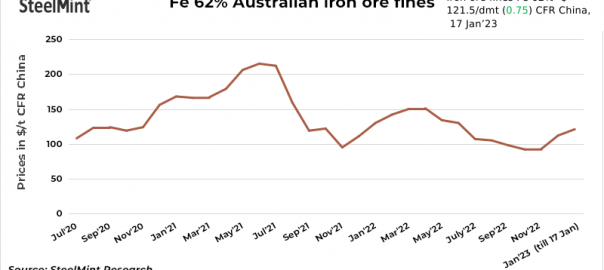 Spot prices of iron ore in China increased d-o-d as the expectations of strong demand post the Lunar New Year holidays boosted trading sentiment. Benchmark Fe 62% fines prices inched up by $0.75/t to $121.5/t CFR on 17 Jan’23. The trading activities at the portside were calm as most market participants were done with their procurement ahead of the holidays.