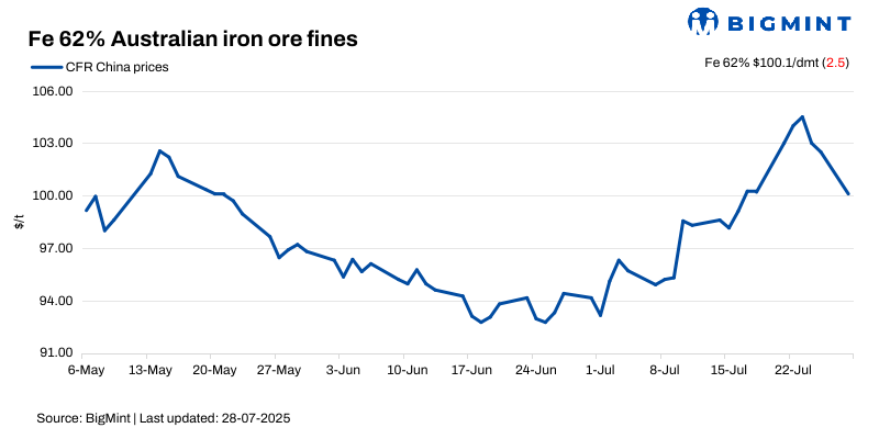 Iron ore fines (Fe 62%) spot prices fell $2.5/dmt d-o-d to $100.1/dmt CFR China on 28 Jul’25, after rallying last week. The decline occurred ahead of the forthcoming Politburo meeting, as fresh trades focused on medium-grade fines. Market attention is now on the potential for new stimulus policies. Chinese port-stock iron prices dropped too, attributed to a cooling off of last week’s positive market sentiment.