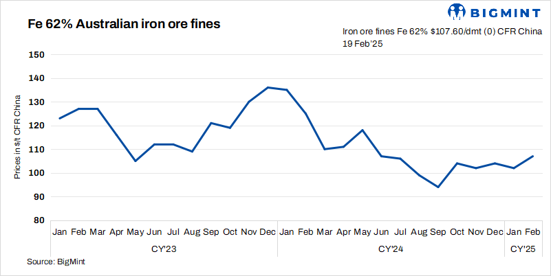 Iron ore fines (Fe 62%) spot prices were steady d-o-d at $107.60/t CFR China on 19 Feb’25 as seaborne trading remained sluggish. Steel production recovery was met with poor margins, prompting mills to prefer partial shipments over full Capesize cargoes. Additionally, discounted medium-grade cargoes were preferred by steelmakers with weak margins, sources highlighted.