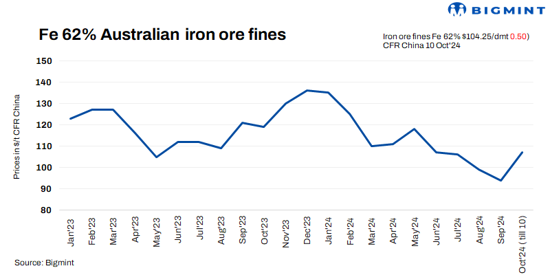 Iron ore fines (Fe 62%) spot prices inched down by $0.5/t to $104.25/t d-o-d CFR China on 10 Oct’24. Steel mills are maintaining low inventory levels and mainly restocking through port spot markets but medium-grade seaborne cargoes are facing losses upon arrival. The market is eagerly waiting for the Ministry of Finance’s upcoming press release on 12 October, anticipating potential macroeconomic policy support.