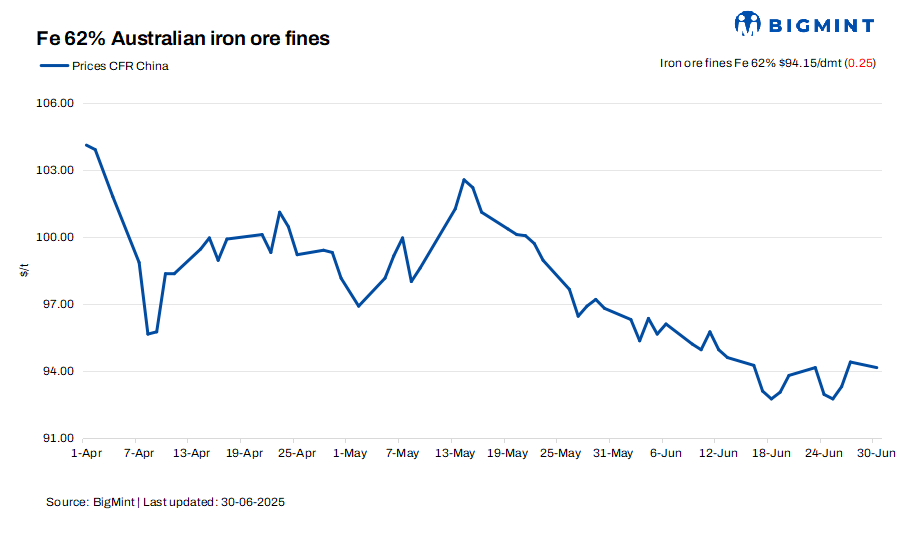 Iron ore fines (Fe 62%) spot prices stood firm at $94.15/t CFR China on 30 Jun’25, unchanged from 27 Jun, supported by continued fresh bookings. Port stock prices stayed rangebound, though market sentiment continued to remain sluggish. Market participants noted growing acceptance of high-phosphorus cargoes, while mid-grade fines gained preference among buyers for cost optimisation.