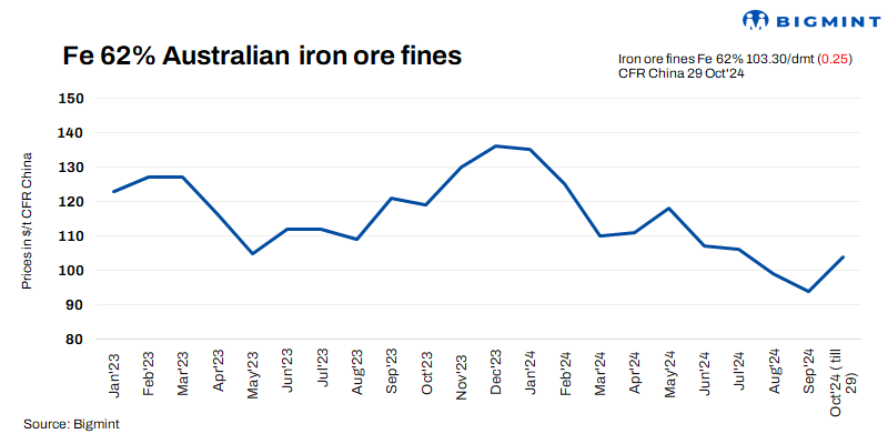 Iron ore fines (Fe 62%) spot prices edged down d-o-d by $0.25/t to $103.30/t CFR China on 29 Oct’24 as limited policy signals from China’s recent Politburo meeting dampened market sentiment. Participants are now eyeing the upcoming National People’s Congress for clearer economic direction. Although Tangshan has lifted emergency pollution controls, the impact of sintering restrictions remained minimal, offering little support to fundamentals.