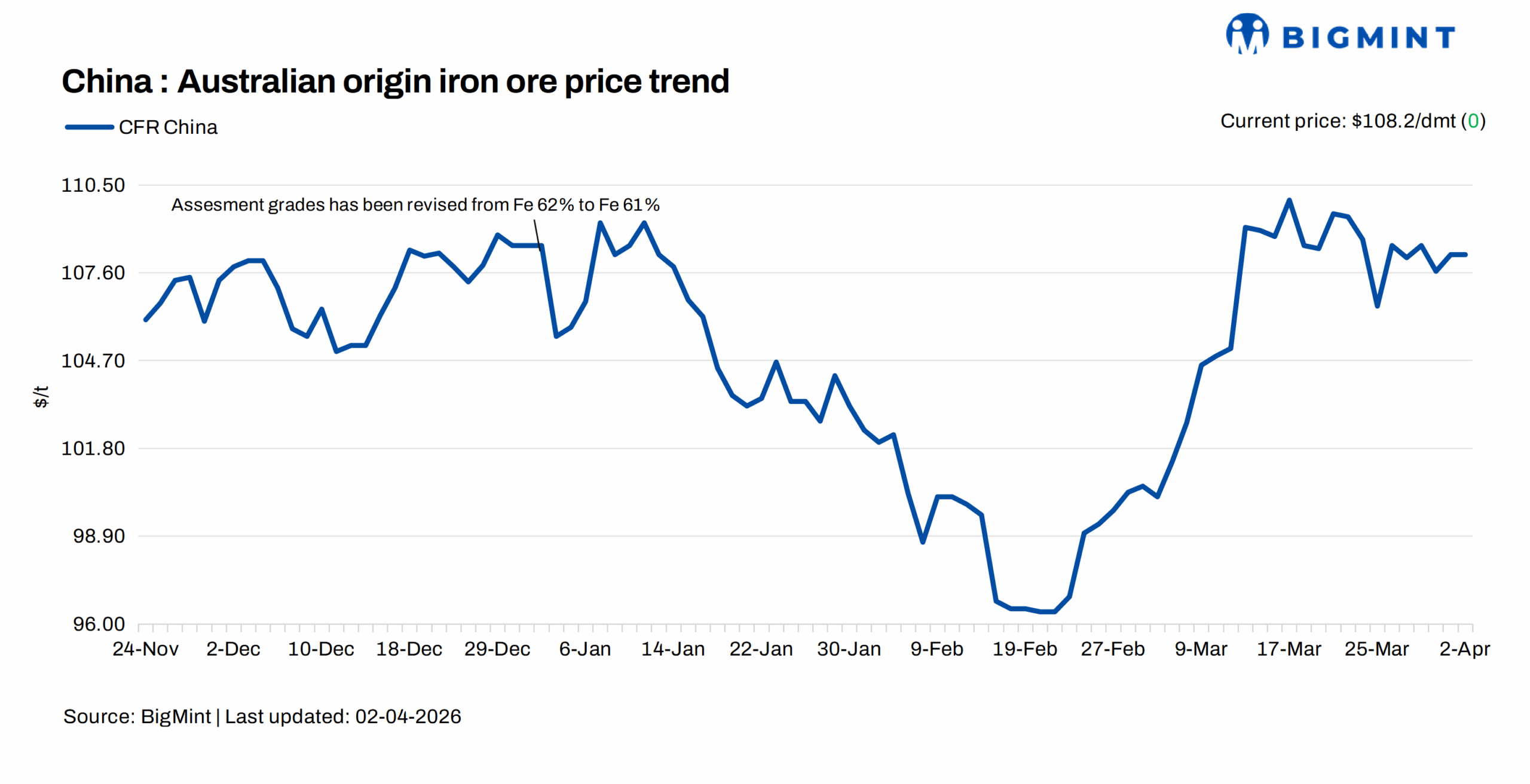Benchmark iron ore fines (Fe61%) spot prices held firm d-o-d at $108.2/dmt CFR China on 2 Apr’26. Persisting uncertainty around non-mainstream fines shipments, due to logistical constraints and elevated fuel costs, continued to support demand for mainstream medium-grade fines, keeping prices steady. Mills remained inclined towards medium- and low-grade fines, while overall market conditions were largely unchanged.