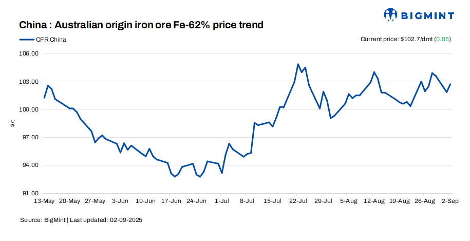 Iron ore fines (Fe 62%) spot prices increased by $0.85/dmt d-o-d to $102.7/dmt CFR China on 2 Sep’25. Prices rose, rebounding from yesterday’s drop, supported by restocking expectations ahead of Golden Week and an anticipated demand pick-up once mills resume operations.Trades are expected to increase in the latter half of the week once the military parade concludes.