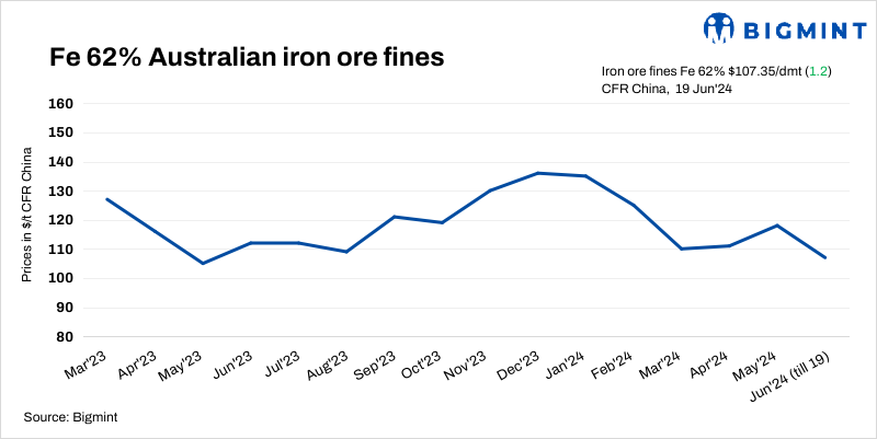 Iron ore fines (Fe 62%) spot prices increased by $1.2/t d-o-d to $107.35/t CFR China on 19 Jun’24. Prices rose after significant volumes of medium-grade fines were traded, but the focus on downstream margins remained crucial for short-term purchases. Chinese portside prices were stable as spot demand was low. However, reports suggest that steel mills are showing little interest in procuring spot cargoes.
