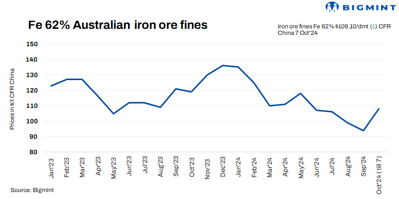 Iron ore fines (Fe 62%) spot prices rose $1/t d-o-d to $109.1/t CFR China on 7 Oct’24 amid optimism around the potential economic stimulus. Today, the NDRC announced pro-growth policies, which are expected to boost the market in addition to the stimulus measures announced before the National Day holidays. Their impact on seaborne prices will be seen after market participants return from their holidays today.