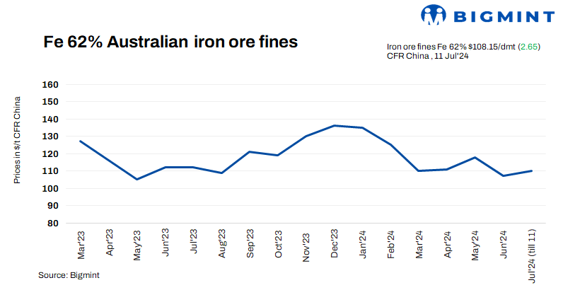 Iron ore fines (Fe 62%) spot prices increased by $2.65/t d-o-d to $108.15/t CFR China on 11 Jul’24 amid mixed market sentiments. The latest steel data showed a decrease in rebar inventories and a recovery in production and demand for HRC, which supported iron ore prices. Meanwhile, market players have low expectations for the next Third Plenary Session and any new policy pronouncements could significantly impact the market’s dynamics.