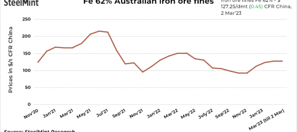 Iron ore spot prices in China inched up by $0.45/t d-o-d to $127.25/t CFR China on 2 Mar’23 on an improved liquidity. The seaborne buying interest strengthened, with several cargoes expected to arrive in March being traded in the secondary market. Some market players preferred to wait after China’s “two sessions” this weekend for additional clarification. Property market expectations are changing too rapidly.