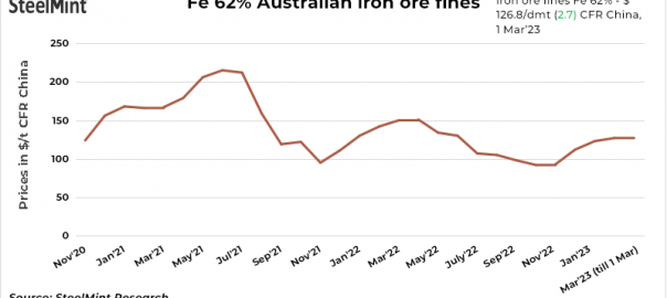 Iron ore spot prices in China increased by $2.7/t d-o-d to $126.8/t CFR China on 1 Mar’23 on the latest Purchasing Managers’ Index (PMI) data. PMI results have exceeded all predictions. Large number of seaborne cargoes are still circulating in the secondary market after March arrivals. As a result, stakeholders have turned cautious. Seaborne buying picked up slightly amid narrower import losses w-o-w.