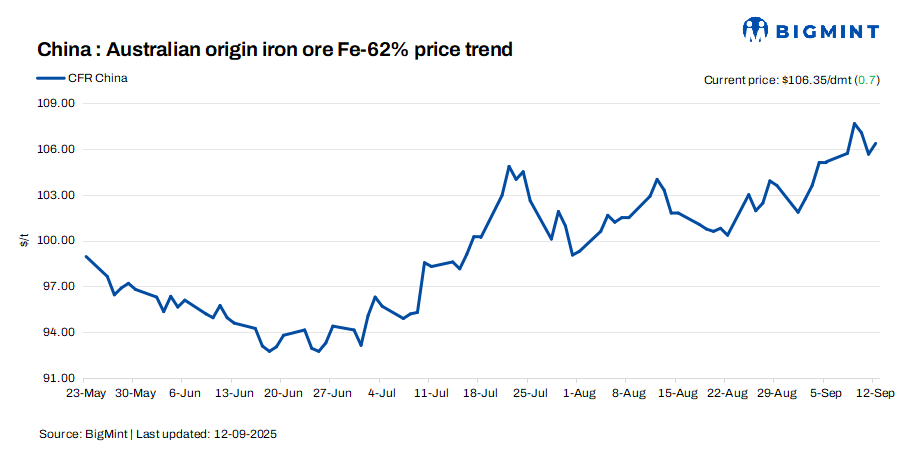 Iron ore fines (Fe 62%) spot prices edged up by $0.7/dmt d-o-d to $106.35/dmt CFR China on 12 Sep’25, amid hopes of stronger downstream demand, easing coking coal costs, and US interest rate cut expectations. However, with thin seaborne trade and healthy port inventories, the rally looks sentiment-driven. Mills prioritised cost-saving blends, and buyers remained cautious to avoid import losses.