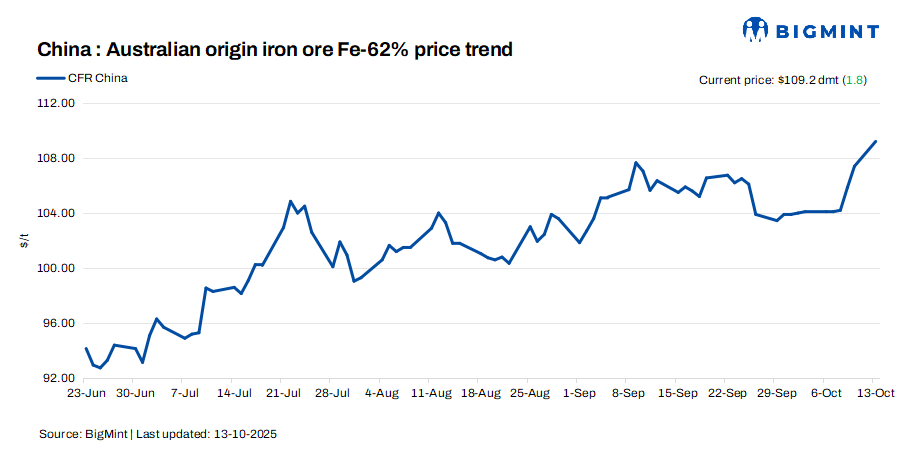 Iron ore fines (Fe 62%) spot prices increased by $1.8/dmt to $109.2/dmt CFR China on 13 Oct against 10 Oct’25. Trading activity strengthened, particularly in blend fines. There were limited discounted blend fines available, which caused prices to rise due to market sentiment. With limited trading occurring over the compensatory working weekend in China, mills conducted more trades today, which helped support iron ore prices.