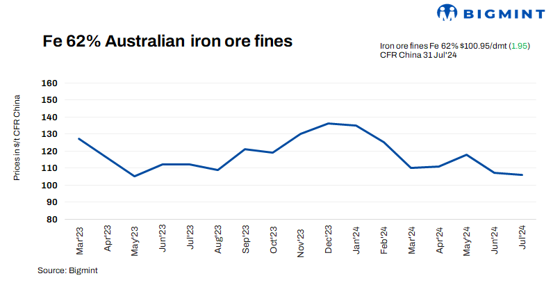 Iron ore fines (Fe 62%) spot prices increased by $1.95/t d-o-d to $100.95/t CFR China on 31 Jul’24 amid fresh trading activity and expectations of a slightly stronger market. More mills are anticipated to implement production cuts after completing their maintenance. The reduction in production from steel mills has affected purchasing in the spot market, leading to decreased procurement volumes.