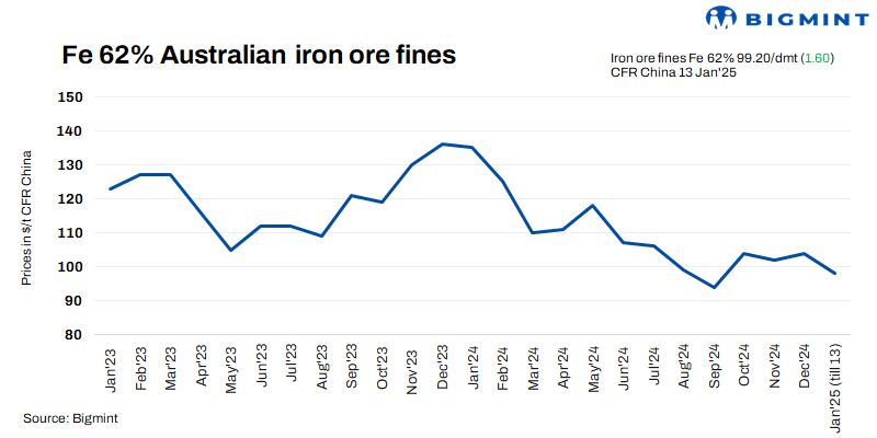 Iron ore fines (Fe 62%) spot prices increased by $1.60/t d-o-d to $99.20/t CFR China on 13 Jan’25, driven by optimism over favourable CY’25 policies hinted at by China’s Ministry of Finance. This improved market sentiment for industrial products, even without specific policies being announced. However, cautious trading ahead of the Lunar New Year and decreased activity capped the price hike, with restocking almost completed.