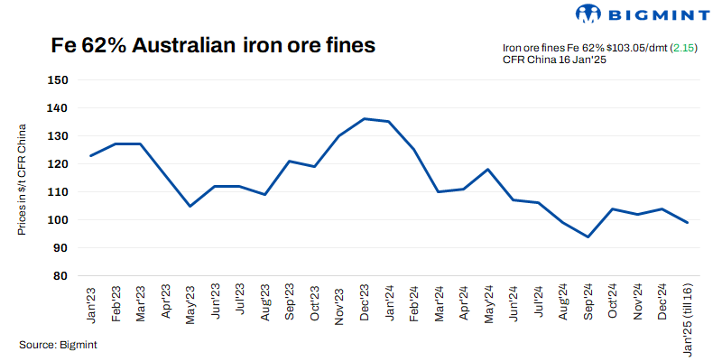 Iron ore fines (Fe 62%) spot prices increased by $2.15/t d-o-d to $103.05/t CFR China on 16 Jan’25. The rise was driven by concerns over heavy rains in Western Australia, and improving finished steel production provided some support. Delays of up to 3-4 days were expected for cargoes. However, there was minimal impact on supply, with liquidity for seaborne fines thin as mills have completed restocking.