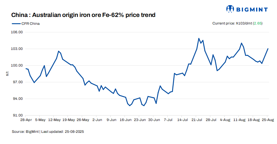 Iron ore fines (Fe 62%) spot prices surged by $2.65/dmt d-o-d to $103/dmt CFR China on 25 Aug’25. The rise was mainly driven by China’s move to ease housing rules in Shanghai from 26 Aug’25, though trades were still slow. Optimism also came from expectations of potential US Fed rate cuts in Oct’25.