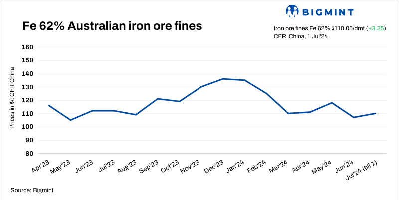 Iron ore fines (Fe 62%) spot prices increased by $3.35/t d-o-d to $110.05/t CFR China on 1 Jul’24 amid some new trading activity at the start of the month. The main focus is on the upcoming third plenary session in mid-July, which may introduce more specific policy benefits. Mills have purchased as needed, as the market may fluctuate before the Plenum, leading to expected volatility.