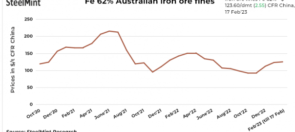 Benchmark iron ore Fe 62% fines prices in China increased by $2.55/t d-o-d to $127.3/t CFR on 17 Feb’23 on decent buying interest. Market confidence over China’s demand for iron ore was supported by rising domestic steel demand and positive news from the country’s National Bureau of Statistics on the real estate industry. Majority of steel mills kept buying iron ore and maintaining their stock levels.