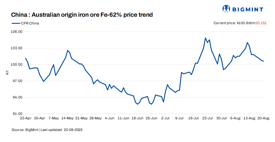 Iron ore fines (Fe 62%) spot prices held largely stable $100.6/dmt CFR China on 20 Aug’25. Market sentiment was shaped by miner tenders, which drew attention away from regular trading and reduced liquidity in medium-grade fines. Ongoing talks of mill maintenance in Hebei added to the cautious mood, while Chinese port prices managed to hold firm despite some pressure from softer futures.