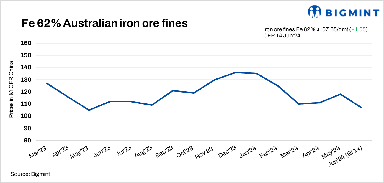 Prices of iron ore fines (Fe 62%) increased by $1.05/t d-o-d to $107.65/t CFR China on 14 Jun’24. The surge in prices continued due to positive macroeconomic news which signals a possible rise in demand in the near term. The increase in pig iron production and higher utilisation rate of the BF-based mills kept iron ore demand and prices supported, BigMint notes.