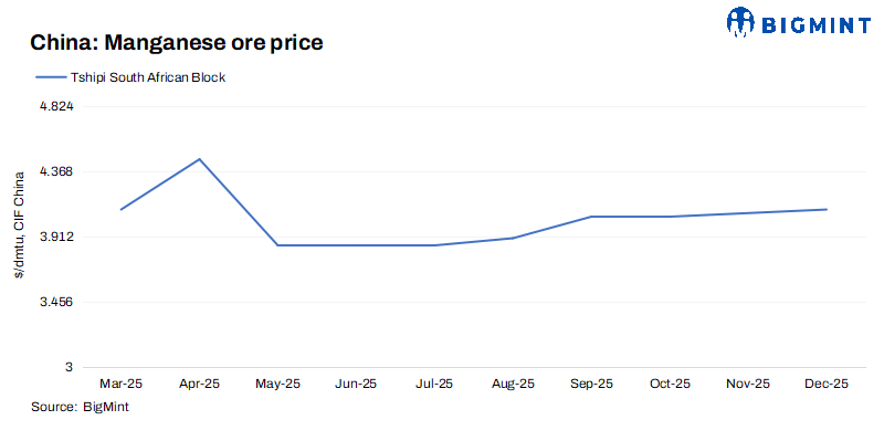 Jupiter Mines Limited, operator of the Tshipi Borwa Manganese Mine in South Africa’s Kalahari manganese field, has announced its Dec’25 offer price for high-grade (Mn 36.5%) semi-carbonate lumps at $4.1/dmtu CIF China. The offer price reflects firm mining and logistics costs, reduced South African supply, and steady procurement interest from Chinese alloy producers for high-grade ore.