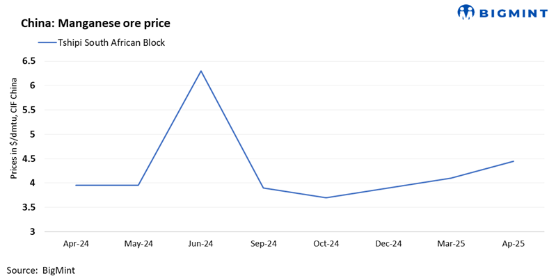 Jupiter Mines Limited, operator of the Tshipi Borwa Manganese Mine in the Kalahari manganese field in South Africa, has set the offer price for Apr’25 shipments of its high-grade Mn36.5% semi-carbonate lumps at $4.45/dmtu CIF China. These prices are up by $0.35/dmtu m-o-m.