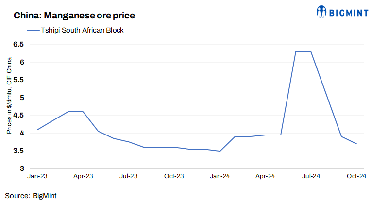 Australia’s Jupiter Mines Limited, the operator of the Tshipi Borwa manganese mine in the southern Kalahari manganese field, has set the CIF China price of its high-grade Mn36.5% South African semi-carbonate lump at $3.7/dmtu for Oct’24 shipments, a $0.2/dmtu m-o-m decrease from its Sep’24 shipment prices.