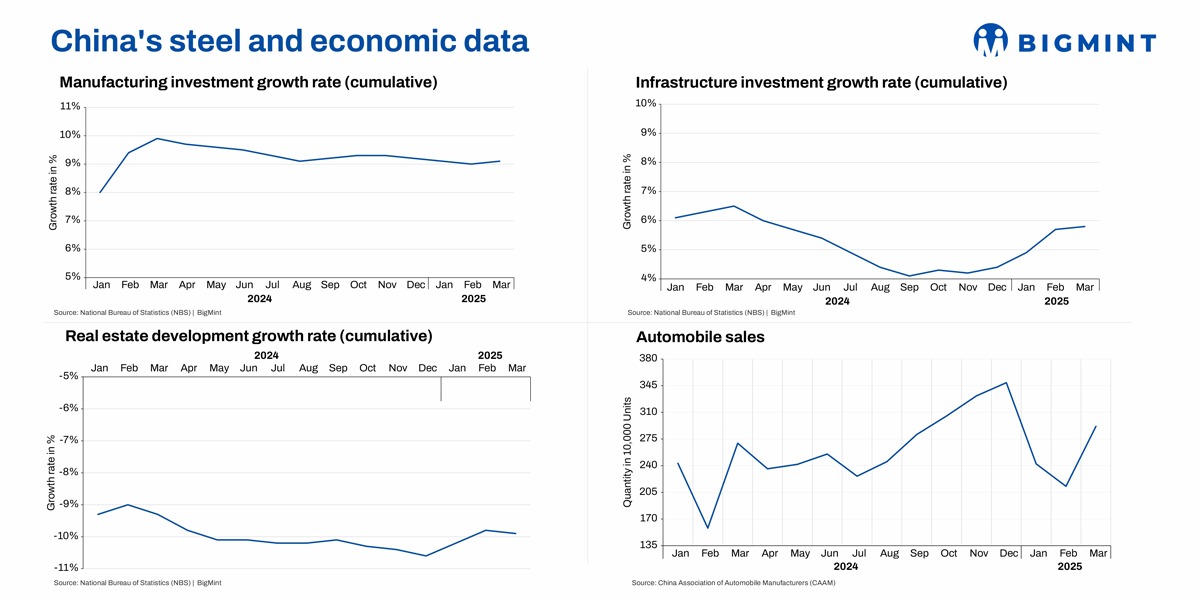 Meanwhile, China’s steel imports fell 11% to 1.55 mnt in the first three months amid slow domestic demand.Manufacturing investment growth range-bound: Manufacturing investment grew marginally to 9.1% in March 2025 against 9% in February. Y-o-y, the average growth in Q1CY’25 was at 9.03 against 9.1% in the same three months in 2024, indicating that the overall trend is range-bound and has remained so for around a year. Automobile production in January-March, 2025 rose a healthy 14.50% y-o-y to 7.56 million units. Plus, the PMI rose to 50.2% in February from 49.1 in January this year and further to 50.5% in March. A PMI of over 50% reflects expansion in factory output. Possibly, expectations of policy support kept manufacturing supported.