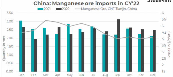 - In Dec’22, manganese ore imports into China stood at 2.53 mnt, a marginal drop of 1% m-o-m.
