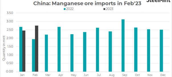 • China imported 2.72 mnt of manganese ore in Feb’23, up 10% m-o-m compared to 2.46 mnt in Jan’23.