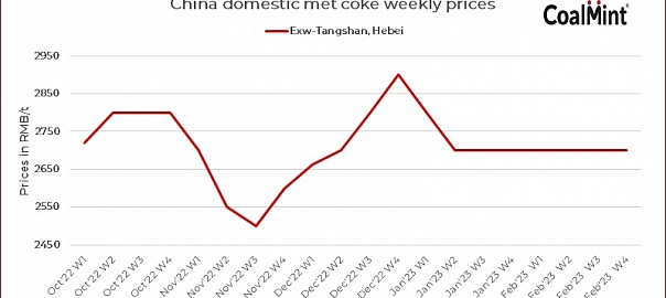 A coke manufacturer has proposed the first round of price hike by RMB 100/t ($14/t). The steel mills showed a mixed response, as they have lower inventory level. In fact, they are also struggling with lower profit margins in steel. As on 28 Feb, Hebei’s Tangshan met coke prices stood at RMB 2,700/t ($398/t).