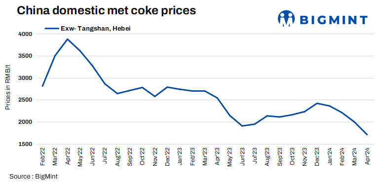 China’s met coke producers have accepted the eighth round of price cut on 10 Apr’24. Met coke prices in Hebei’s Tangshan were assessed at RMB 1,660/t ($230/t), a decrease of RMB 100/t ($14/t) d-o-d. Despite production constraints, inquiries from southern mills persist, with some favouring cost-effective Australian seaborne coke over domestic options.