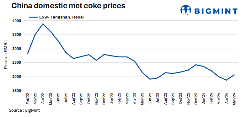 China’s met coke producers have accepted the fourth round of price hike on 1 May’24. Met coke prices in Hebei’s Tangshan were assessed at RMB 2,060/t ($285/t), an increase of RMB 100/t ($14/t) d-o-d. Despite tight supply and escalating coal costs, increased demand from steel mills drove coke prices upward. Steelmakers raised purchase prices, anticipating further price hikes after the holiday period.