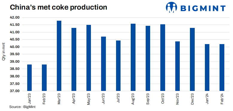 China’s metallurgical coke production witnessed an increase of 3.6% y-o-y, reaching 80.39 mnt in Jan-Feb’24 as against 77.63 mnt in Jan-Feb’23, as per the National Bureau of Statistics. Meanwhile, Met coke prices in Hebei’s Tangshan were assessed at RMB 1,960/t ($276/t).