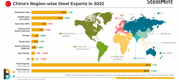 China’s steel exports to the Middle East and Africa rose 23% in 2022. This geography is emerging as an important export destination for China, as it grapples with a real estate market crisis, unprecedented Covid surges, and policy-driven production cuts with an eye on its decarbonisation goals.