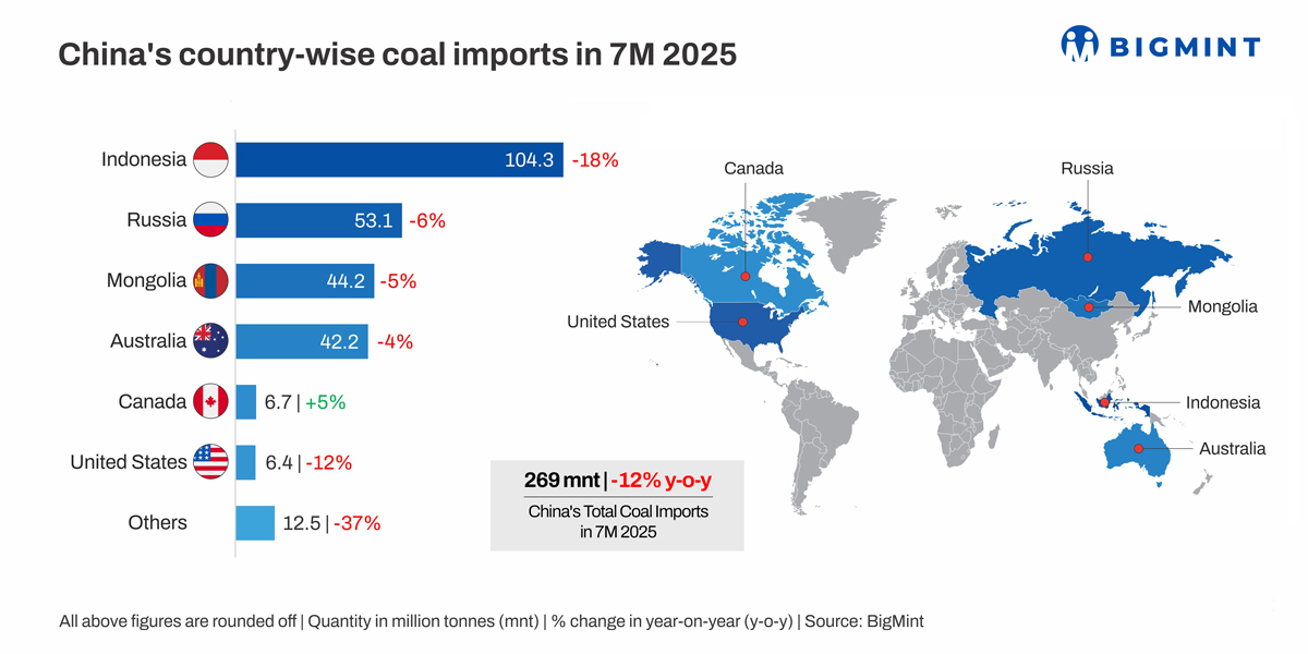 Morning Brief: China, the world’s top producer and consumer of coal, recorded an over 12% decline in total coal imports in January-July 2025 (7MCY’25), according to latest data available with BigMint. Total coal imports, including thermal and metallurgical coal, dropped to around 269 million tonnes (mnt) in 7MCY’25 as against 307 mnt in the corresponding period of CY’24.