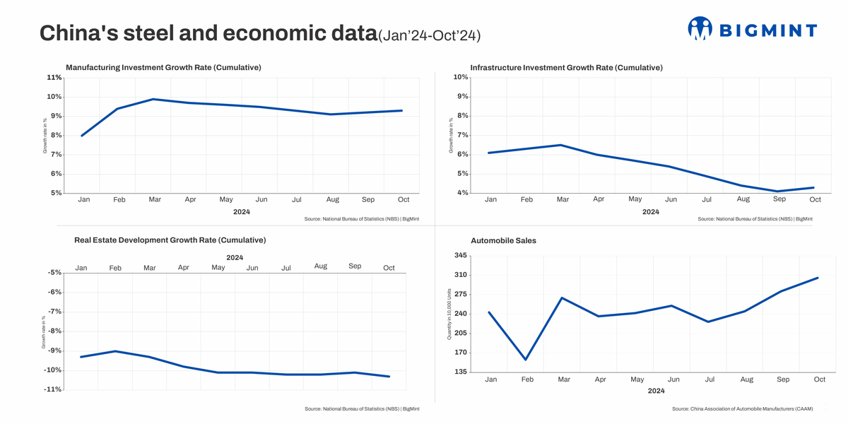 Infra investment spend up m-o-m, down y-o-y: Infra investments also rose to 4.3% m-o-m against 4.1% in September thanks to the stimulus, but averaged a lower 5.37% over 10MCY’24 against 7.55% in 9MCY’24. As per an expert, China is likely to fall roughly RMB 6.5 trillion short of the investment necessary to reach its 5% GDP growth target for 2024. Government spending has been reined in because of over-exposure to debt, leading to financial instability. Plus, the housing sector collapse has also contributed to negative sentiments in infrastructure spending. Moreover, as per indications, China is shifting its infra focus from traditional steel-intensive projects like roads and bridges to new-age areas like cutting-edge telecom networks, EVs, high-speed rails, which require low-volume but specialised steels